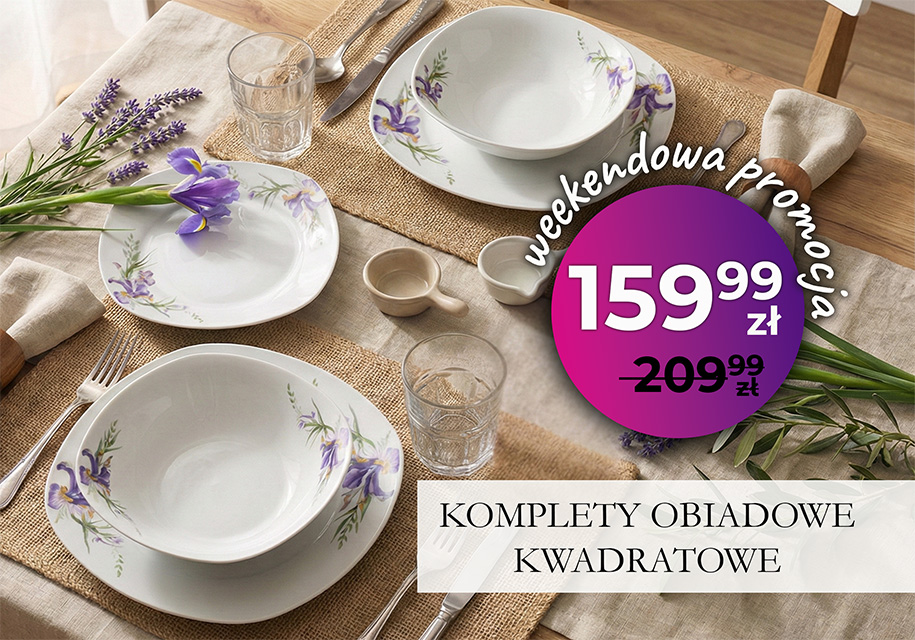 Szybki podgląd Dodaj do Schowka -50,00 zł Nowy Komplet obiadowy dla 6 osób zestaw talerzy kwadratowy PRIMA DECO Irys... Cena podstawowa 209,99 zł -50,00 zł Cena 159,99 zł Porcelanowy zestaw obiadowy na 6 osób, składający się z 18 elementów: talerzy płytkich, deserowych i miseczek, ozdobionych motywem kwiatów irysa.... Dodaj do koszyka
