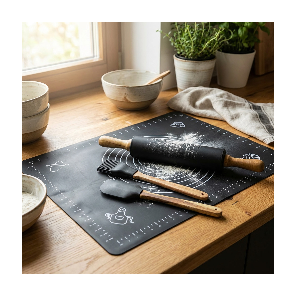 4-elementowy zestaw silikonowych przyborów do pieczenia w kolorze czarnym. W zestawie stolnica, wałek, łopatka i pędzelek. Łatwy w czyszczeniu i przechowywaniu.