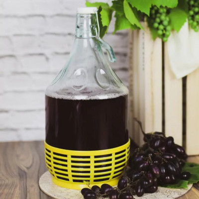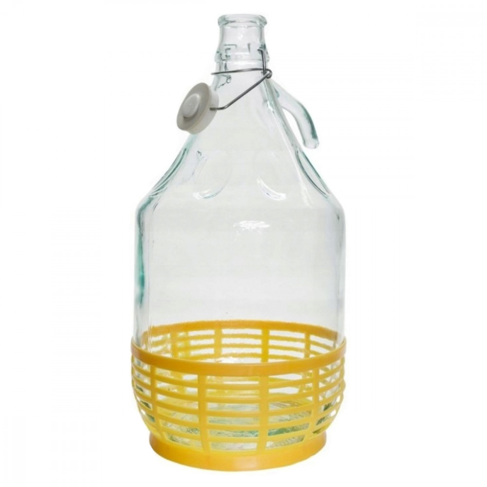 Szklany galon o pojemności 5l z zamknięciem w formie klipsa, w żółtym koszyku. Do fermentacji jak i przechowywania wina.