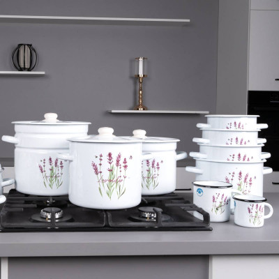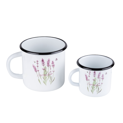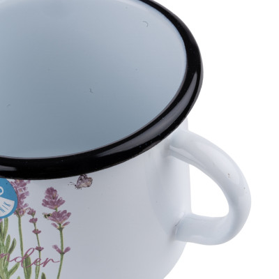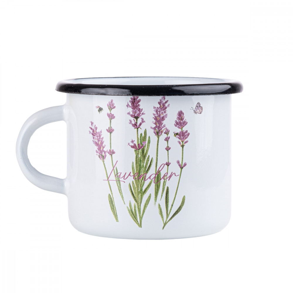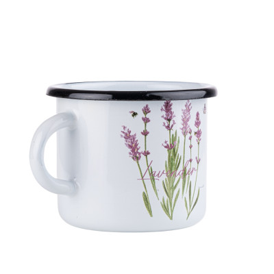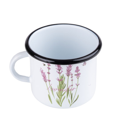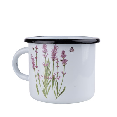 Kubek emaliowany z serii Lawenda o pojemności 0,5l. Wykonany z masywnej stali węglowej, pokrytej z zewnątrz i wewnątrz białą emalią. Rant w kolorze czarnym. Zdobiony kolorową grafiką kwiatów lawendy w fioletowo-różowej kolorystyce, dzięki czemu oprócz funkcjonalności będzie także świetnym elementem dekoracyjnym kuchennych wnętrz.