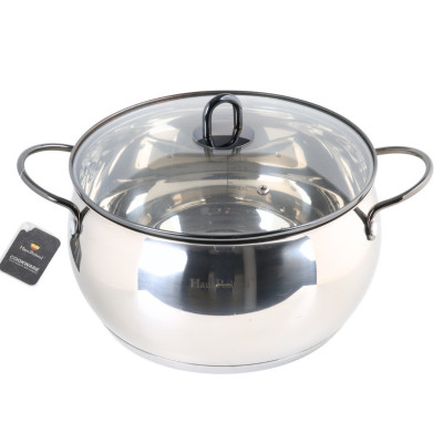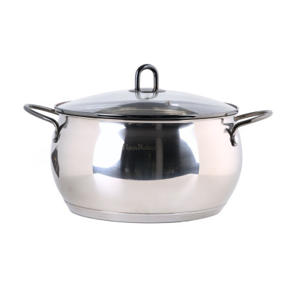 Komplet garnków ze stali nierdzewnej marki Haus Roland, w kształcie baryłki, ze szklanymi pokrywkami i czarnymi uchwytami. Idealny do przygotowywania domowych posiłków dla całej rodziny. W zestawie garnki o pojemnościach: 2,6l, 3,6l oraz 6,1l.