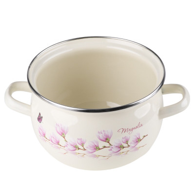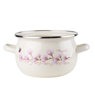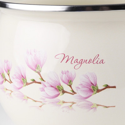 Garnki emaliowane to naczynia których często używały nasze mamy i babcie, jednak wciąż są chętnie wybierane jako naczynia go gotowania. Ich popularność nie mija, dzięki funkcjonalności i barwności wzorów o czym przekonuje komplet kremowych garnków z dekoracją różowych kwiatów magnolii z motylkiem, który wpiszę się w stylistykę większości kuchni, szczególnie w stylu rustykalnym i tradycyjnym.