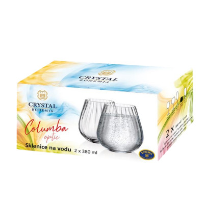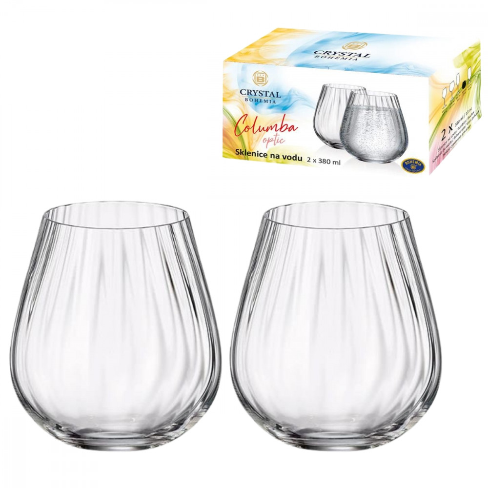 Zestaw 2 szklanek do drinków i napojów 380 ml z serii COLUMBA OPTIC, czeskiej marki CRYSTAL BOHEMIA. Wyróżniają się ciekawym kształtem oraz eleganckim tłoczeniem na powierzchni w postaci pionowych wypukłości przepięknie załamujących światło. Dodadzą wyjątkowego akcentu od codziennych posiłków po wyjątkowe okazje i spotkania w gronie rodziny i znajomych.