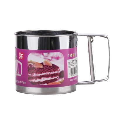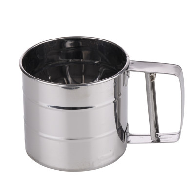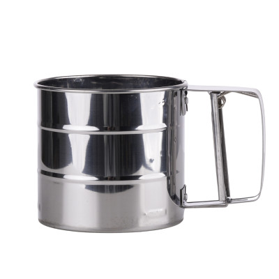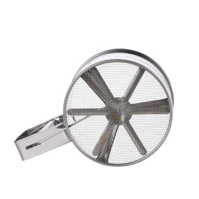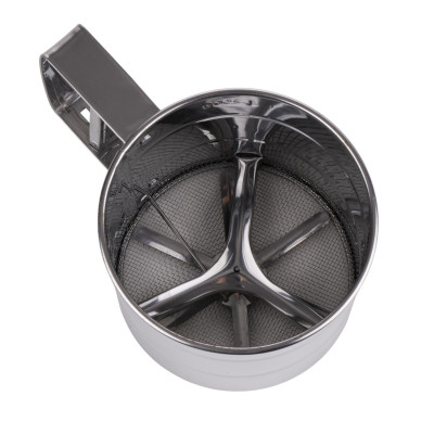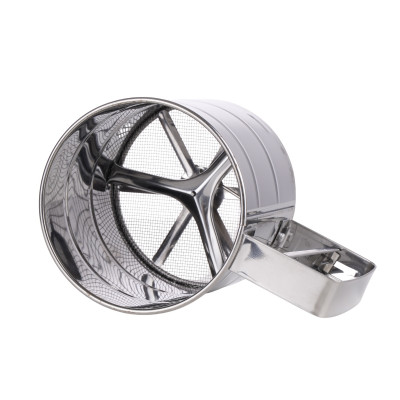 Stalowy przesiewacz do mąki czy cukru pudru o średnicy 10 cm.