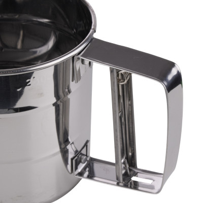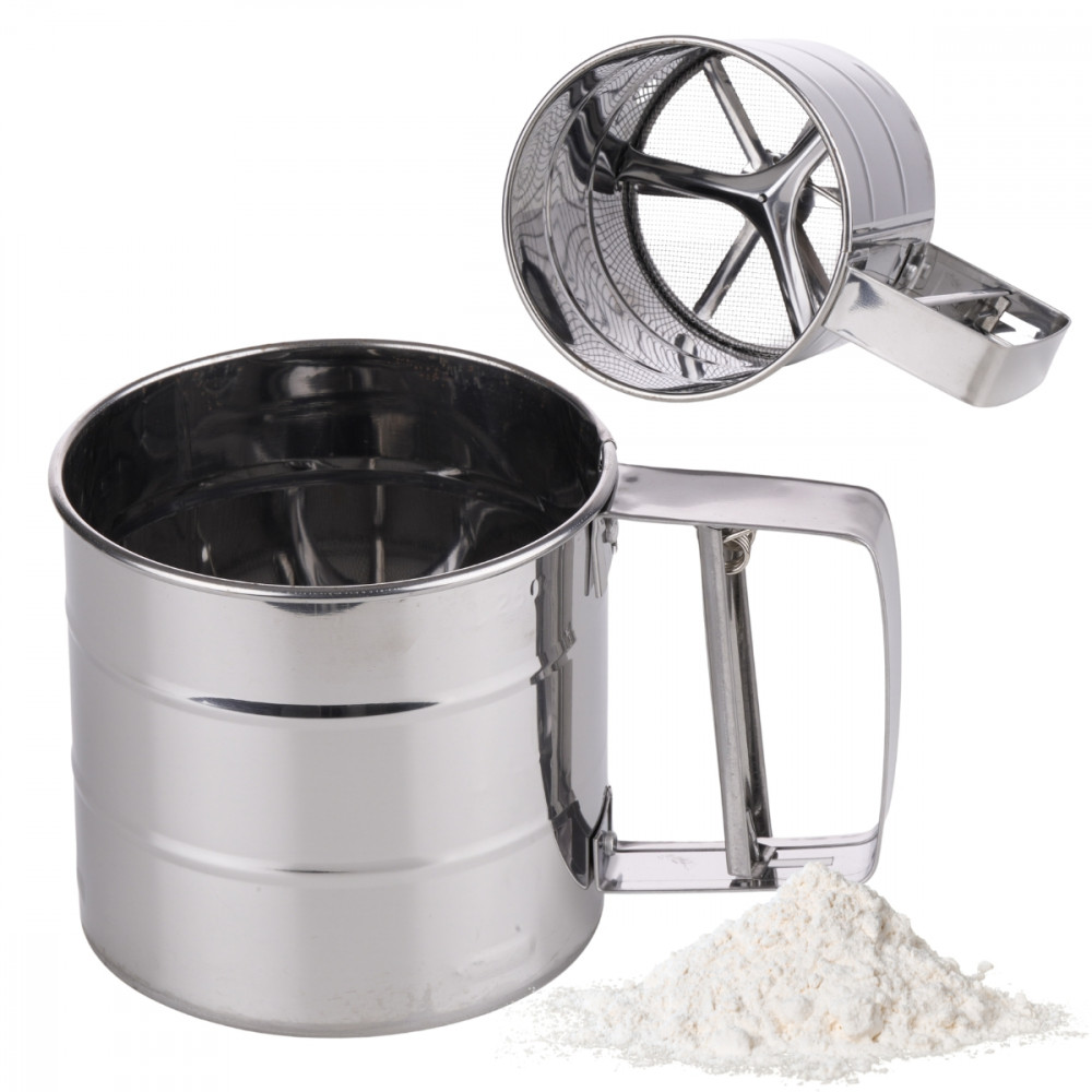 Przesiewacz do mąki w kształcie kubka z poręcznym uchwytem to gadżet niezbędny podczas pieczenia ponieważ przesiana i napowietrzona mąka, bez grudek to sekret udanych wypieków. Wykonany ze stali nierdzewnej polerowanej na wysoki połysk. Wyposażony na dnie w sitko o drobnych oczkach, co razem z mechanizmem sprężynowym wbudowanym w uchwyt i systemem śmigieł umożliwia szybkie i sprawne przesiewanie.