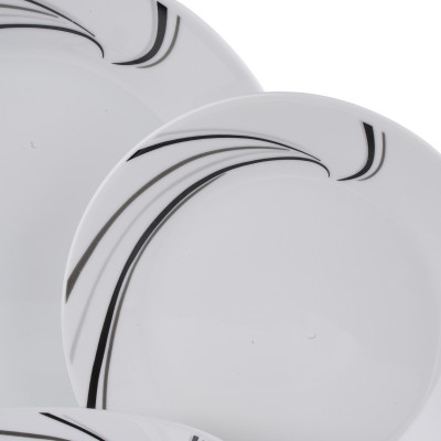 Porcelanowy, 18-elementowy zestaw talerzy dla 6 osób z dekoracją czarnych i szarych paseczków. W okrągłym kształcie.