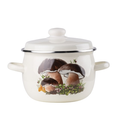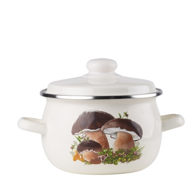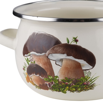 Komplet 4 garnków emaliowanych z pokrywkami marki EMALIA RYBNIK w kolorze kremowym. W baryłkowatym kształcie, zdobione grafiką grzybków. Idealne do przygotowywania domowych posiłków dla całej rodziny.