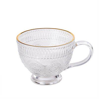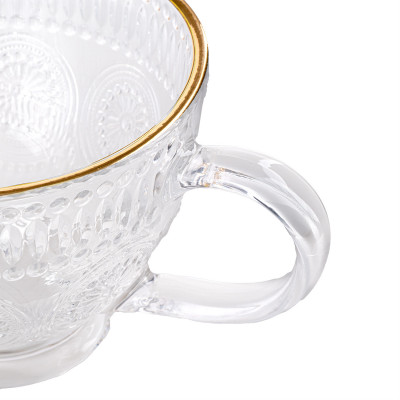 Komplet sześciu przezroczystych filiżanek 400 ml ze złotym rantem, pięknym tłoczeniem i wygodnym uchem. Przeznaczone do serwowania kawy, herbaty oraz innych napojów.