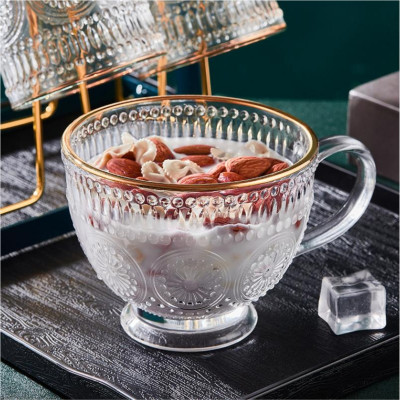 Zestaw 6 filiżanek szklanych z tłoczeniem i złotym rantem 400 ml do kawy herbaty