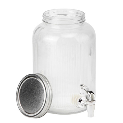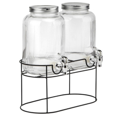 Komplet 2 szklanych słojów z kranikiem o pojemności 3,8 l każdy, umieszczonych w stabilnym, metalowym stojaku. Idealne do serwowania lemoniady, soków, wody smakowej oraz ponczu w domu czy podczas przyjęć i imprez plenerowych.