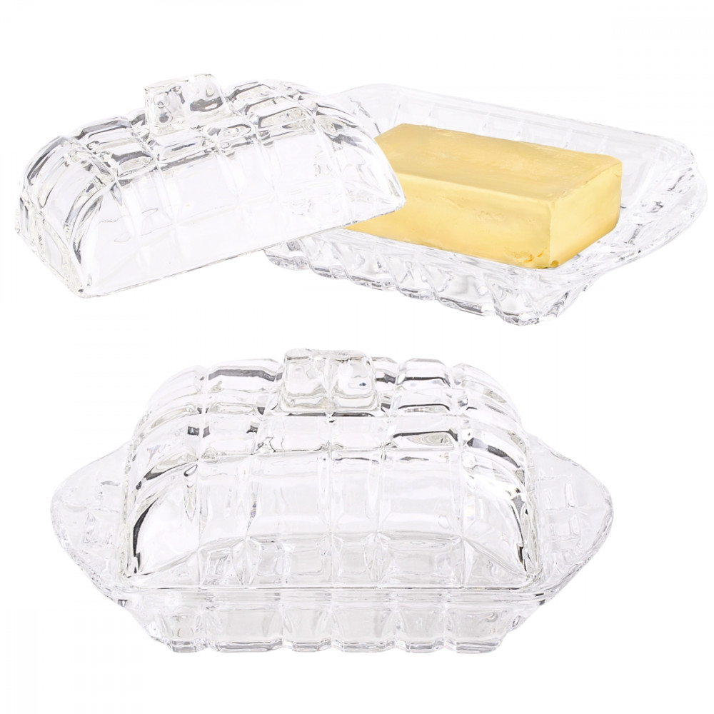 Maselnica szklana tłoczona „Karo” z pokrywką – elegancki pojemnik na masło