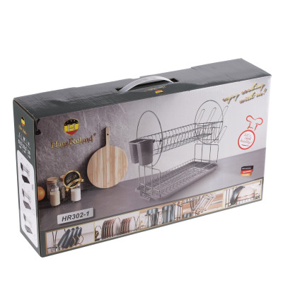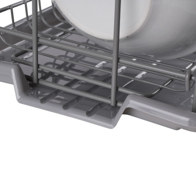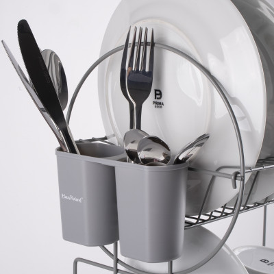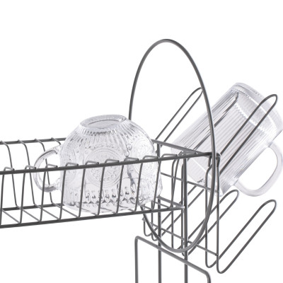 Prezentowana suszarka do naczyń składa się ze stelaża wykonanego z drutu pokrytego szarą farbą, co oprócz zabezpieczenia przed korozją czyni ją bardzo stylową oraz plastikowego ociekacza na sztućce i tacy zbierającej wodę. Na długo zachowa nienaganny wygląd i wpisze się w stylistykę większości kuchennych wnętrz. Lekka konstrukcja jest łatwa w przenoszeniu oraz pielęgnacji.