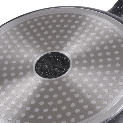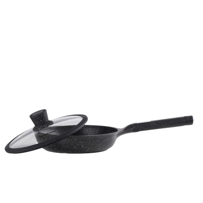 Poręczna patelnia o średnicy 24 cm do codziennego przygotowywania potraw, w standardowym uniwersalnym rozmiarze z pokrywką szklaną. Korpus aluminiowy szybko się nagrzewa i równomiernie rozprowadza ciepło na całej powierzchni, co ułatwia uzyskanie powtarzalnych rezultatów – bez miejsc, które przypalają potrawę. Powłoka nieprzywierająca z nakrapianym wykończeniem skutecznie ogranicza przywieranie i pozwala smażyć z minimalną ilością tłuszczu. Dzięki temu łatwiej utrzymać naczynie w czystości – wystarczy przetrzeć miękką gąbką.