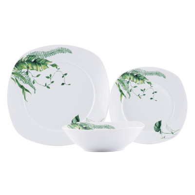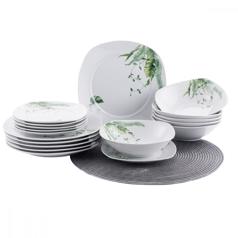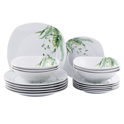 Porcelanowy zestaw obiadowy na 6 osób, składający się z 18 elementów: talerzy płytkich, deserowych i miseczek, ozdobionych subtelnym motywem zielonych liści. Uniwersalny komplet do codziennego użytku lub na rodzinne spotkania. W kwadratowym kształcie.