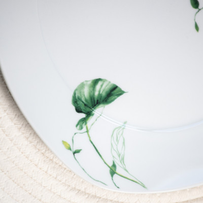 Komplet składa się z 18 elementów pozwalających wygodnie podać pełny posiłek dla 6 osób. W zestawie znajdują się duże talerze obiadowe, miseczki przeznaczone do zup oraz mniejsze talerzyki idealne na desery czy przekąski. Delikatna, roślinna dekoracja ożywi każdy stół i sprawi, że serwowanie potraw będzie jeszcze przyjemniejsze – zarówno podczas rodzinnego obiadu, jak i kameralnej kolacji.