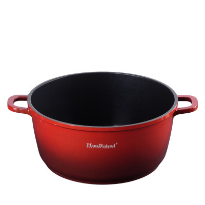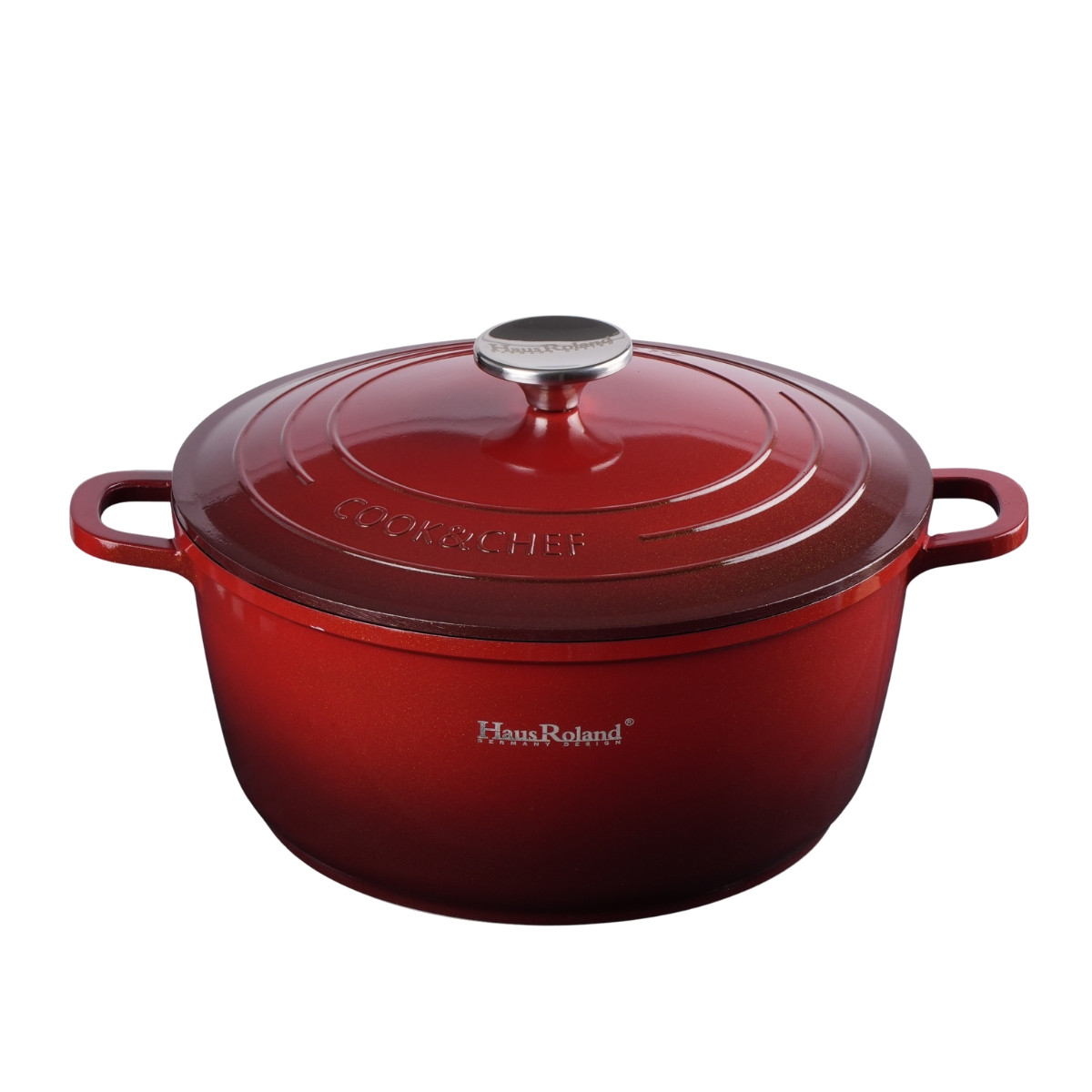 Garnek aluminiowy 7l w kolorze czerwonym z efektem ombre, z nieprzywierającym wnętrzem i dopasowaną pokrywką z metalową gałką. Równomiernie rozprowadza ciepło. Praktyczny wybór do codziennego gotowania zup, gulaszy i dań jednogarnkowych, makaronów na różnych kuchenkach: indukcji, gazie, płycie ceramicznej i elektrycznej.