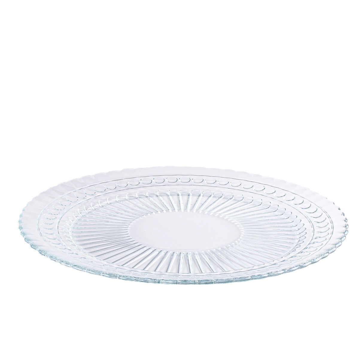 Szklany talerz o średnicy 32 cm ze zdobioną krawędzią i promienistym wzorem. Elegancka patera do serwowania ciast, tart, serników i przekąsek.