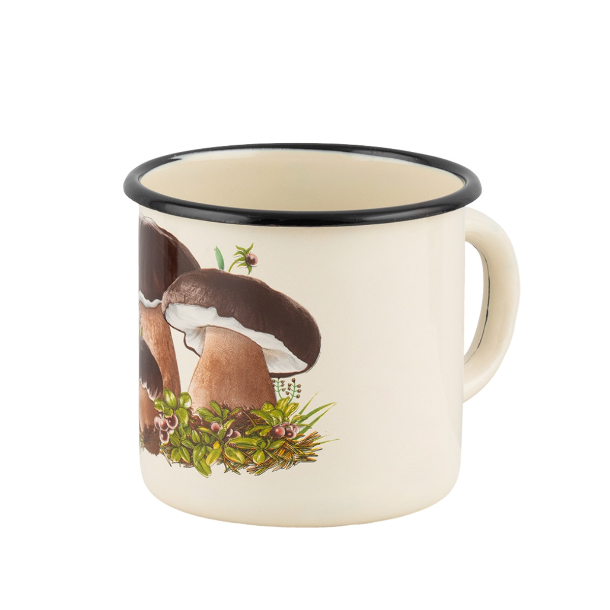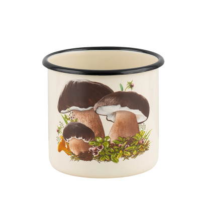 Kubek emaliowany marki EMALIA RYBNIK Grzybki o pojemności 1l. W kolorze kremowym, zdobiony motywem dorodnych prawdziwków.