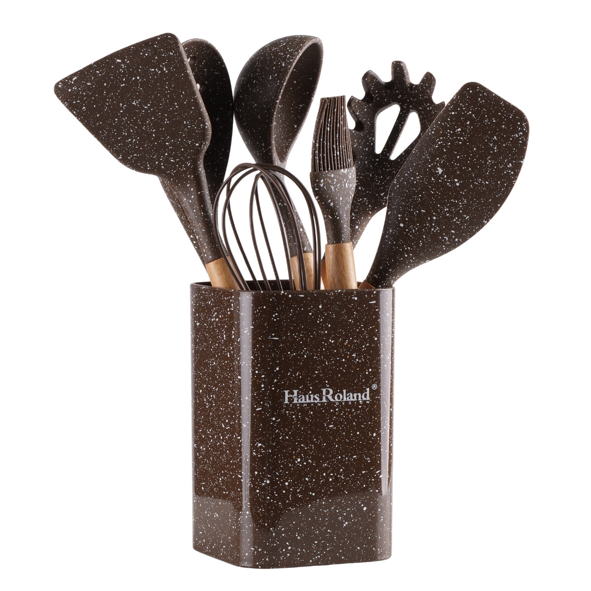Zestaw przyborów kuchennych w stojaku 8 el brązowy silikonowe drewniane rączki
