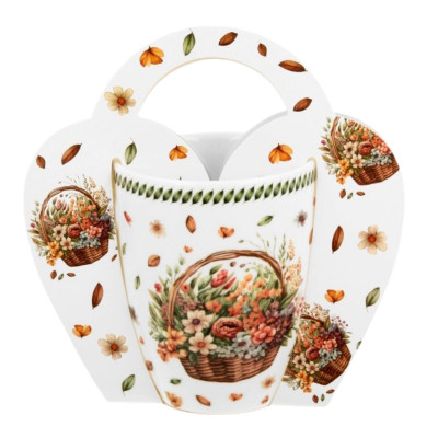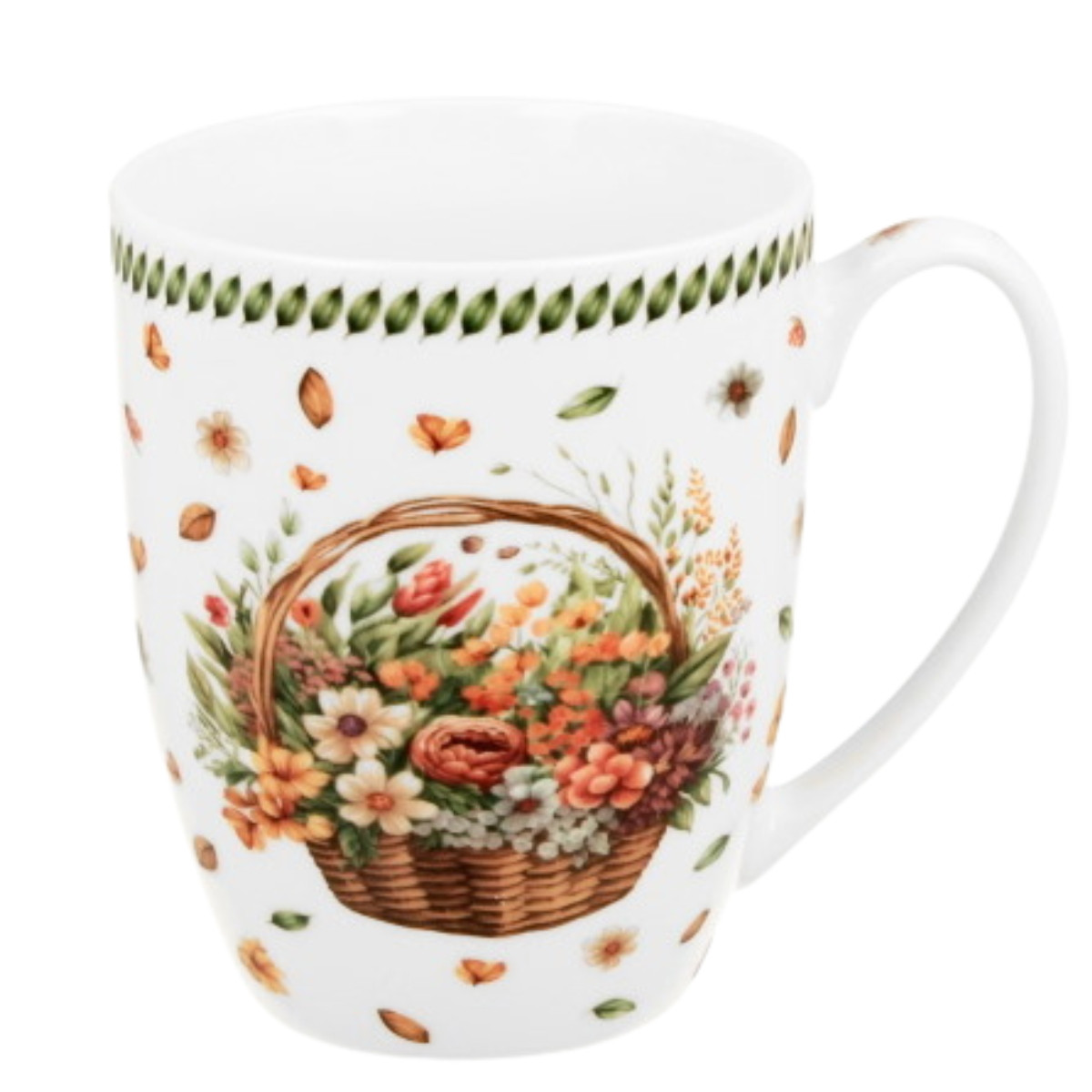 Kubek porcelanowy 350 ml Polne kwiaty, wykonany z porcelany New Bone China, która charakteryzuje się naturalną kremowo - białą barwą z delikatnym połyskiem, a także wyjątkową trwałością w codziennym użytkowaniu. Zdobiony motywem wiklinowego koszyka wypełnionego bukietem kolorowych polnych kwiatów i liści w lekko jesiennym klimacie - dominujące kolory to odcienie złota, burgundu i głębokiej zieleni – idealnie wpisujące się w jesienną paletę.