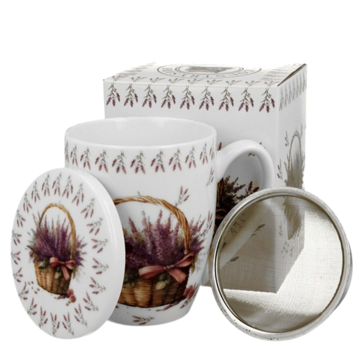 Kubek porcelanowy z zaparzaczem o pojemności 350 ml, zdobiony motywem lawendy w koszyku. Świetny do serwowania aromatycznej herbaty oraz ziół.