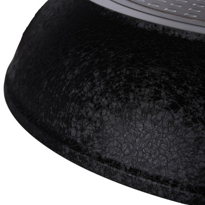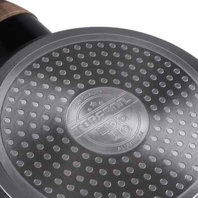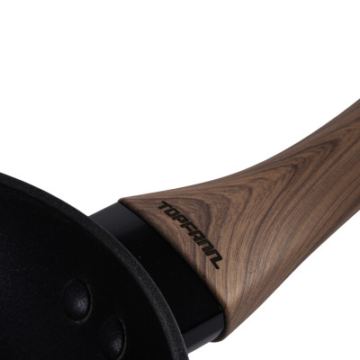 Wykonana z trwałego aluminium pokrytego powłoką nieprzywierającą non-stick, pozwala smażyć bez przypalania i z mniejszą ilością tłuszczu. Z zewnątrz pokryta strukturą o wyczuwalnej pod palcem, chropowatej teksturze przypominającej pęknięcia, która w zależności od padającego światła daje wrażenie satynowego połysku, nadającą jej doskonały wygląd na długi czas. Dopełnieniem patelni jest wyprofilowana, nienagrzewająca się rączka pokryta imitującą drewno powłoką, która doskonale komponuje się z czarnym korpusem. Gładka w dotyku warstwa silikonowa Soft Touch zapobiega wyślizgnięciu, pozwala na wygodny i pewny chwyt nawet w mokrych dłoniach oraz umożliwia bezpieczne korzystanie z patelni, bez ryzyka oparzenia. Otwór na rączce umożliwia powieszenie patelni na haczyku, oszczędzając miejsce w szufladzie.
