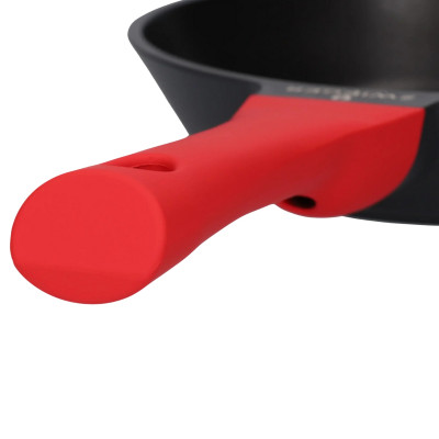 Ergonomiczny czerwony uchwyt z tworzywa PP pokryty miękkim materiałem soft touch nie nagrzewa się i daje pewny chwyt, co umożliwia bezpieczne korzystanie z patelni, bez ryzyka oparzenia. Otwór na rączce umożliwia powieszenie patelni na haczyku, oszczędzając miejsce w szufladzie. Nowoczesny, kontrastowy design - połączenie czerni i czerwienia - doda energii każdej kuchni.
