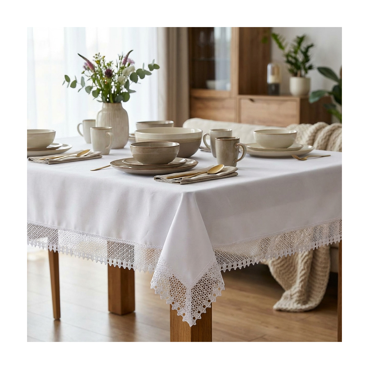 Śnieżnobiały kolor rozjaśnia wnętrze i stanowi doskonałe tło dla każdej zastawy stołowej – od klasycznej białej porcelany po nowoczesne, kolorowe serwisy. Efektowna koronkowa gipiura o misternym wzorze zdobi brzegi obrusu, tworząc luksusową ramę, która kontrastuje z gładką powierzchnią środkowej części. Tkanina poliestrowa jest miękka w dotyku, a jednocześnie wytrzymała i odporna na zagniecenia, co ułatwia utrzymanie nienagannego wyglądu nawet podczas długich przyjęć.