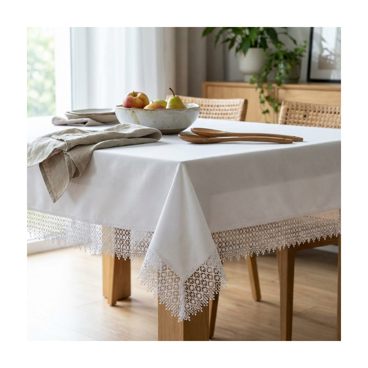 Śnieżnobiały kolor rozjaśnia wnętrze i stanowi doskonałe tło dla każdej zastawy stołowej – od klasycznej białej porcelany po nowoczesne, kolorowe serwisy. Efektowna koronkowa gipiura o misternym wzorze zdobi brzegi obrusu, tworząc luksusową ramę, która kontrastuje z gładką powierzchnią środkowej części. Tkanina poliestrowa jest miękka w dotyku, a jednocześnie wytrzymała, odporna na zagniecenia i łatwa w prasowaniu, co ułatwia utrzymanie jego nienagannego wyglądu przez długi czas.
