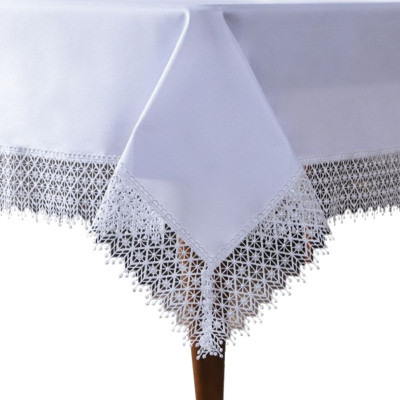 Obrus o wymiarach 140x300 cm, w klasycznym białym kolorze, na obrzeżach zdobiony koronką. Wykonany z wysokiej jakości poliestru, prostokątny. Pięknie ozdobi każdy stół.
