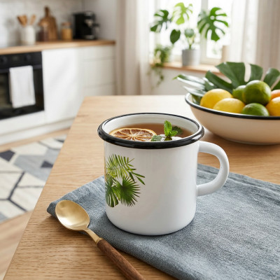 Kubek emaliowany Monstera charakteryzuje się prostym kształtem i ozdobną grafiką zielonych liści monstery na białym tle, dzięki czemu wpisze się w stylistykę większości kuchni, szczególnie w stylu rustykalnym i tradycyjnym. Bazuje na tradycji naczyń emaliowanych, które pamiętają nasze babcie oraz mamy, jednakże w odświeżonym wydaniu. Duży, wyprofilowany uchwyt umożliwia jego komfortowe przenoszenie. Prócz wysokiej funkcjonalności wyróżnia się także walorami dekoracyjnymi.