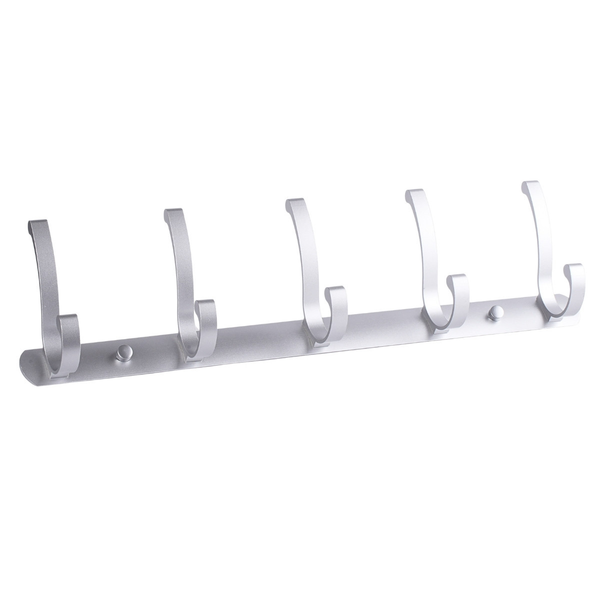 5-hakowy, ścienny wieszak na ubrania w kolorze srebrnym, wykonany z aluminium. Do łazienki, kuchni czy przedpokoju.