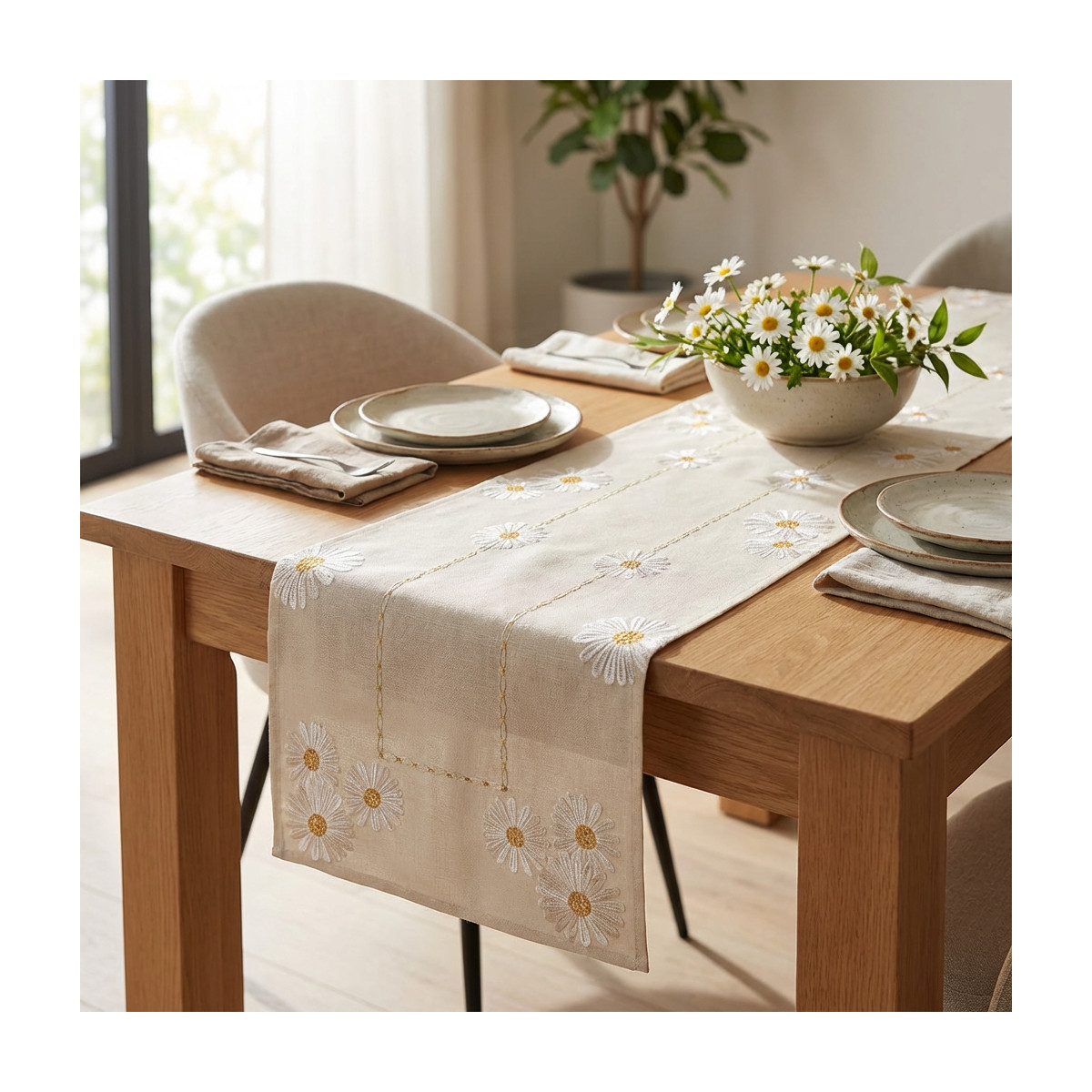 Jasny bieżnik (50x100 cm) zdobiony precyzyjnym haftem w stokrotki. Wiosenny akcent, który ożywi Twój stół.
