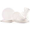 Komplet zawiera po 6 sztuk talerzy płaskich, deserowych i miseczek, co umożliwia pełne podanie tradycyjnego obiadu z przystawką, zupą i deserem. Lekko kremowy odcień nadaje całości uniwersalności i subtelnego ciepła, a ryflowanie na obrzeżach ułatwia trzymanie i sprawia, że zastawa wygląda bardzo elegancko. Klasyczny okrągły kształt jest bardzo uniwersalny.