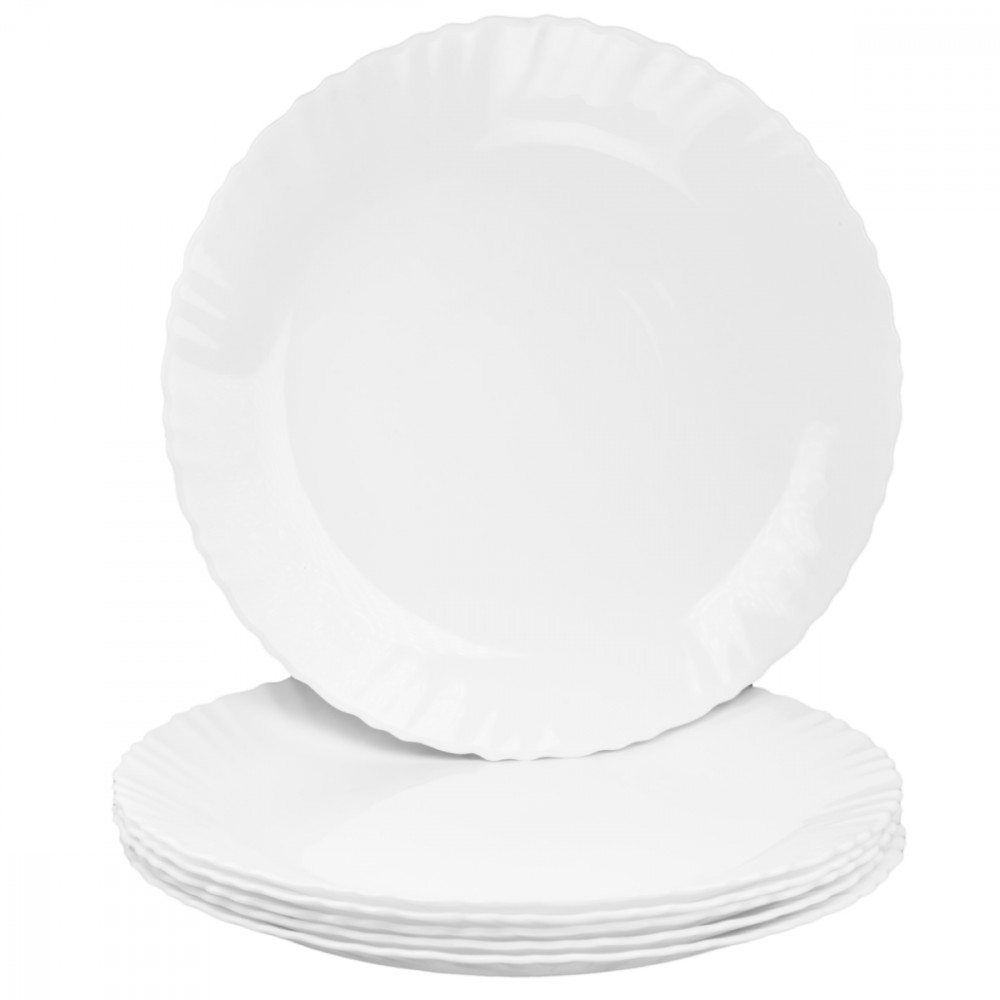 Kpl. 6 talerzy obiadowych o średnicy 25 cm z karbowanym zdobieniem rantu. Wykonane z białego szkła hartowanego.